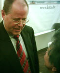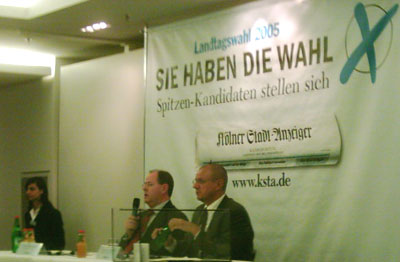 Steinbrück mahnt die Leistungselite NRW-Ministerpräsident glaubt weiter an einen Sieg von Rot-Grün bei Landtagswahl Von Markus Dufner Köln - Der nordrhein-westfälische Ministerpräsident Peer Steinbrück hat die “wirtschaftliche Leistungselite” aufgefordert, eine Vorbildfunktion zu übernehmen. Die Offenlegung von Managergehältern, die eine zum Teil nicht mehr nachvollziehbare Höhe erreicht hätten, gehöre zur Transparenz dieser Gesellschaft. Im Gegen-satz zu Baden-Württemberg soll es in NRW keine Abschaffung des Bafög geben. Auch Studiengebühren lehnte Steinbrück bei einer Podiumsdiskussion am Dienstag ab. “Bei uns wird es keine soziale Auslese über das Portemonnaie der Eltern geben.” Der Standard könne über einen Qualitätspakt mit den Universitäten gehalten werden. Hinsichtlich der Landtagswahl am 22. Mai zeigte sich der SPD-Politiker zuversichtlich. Entscheidend seien die letzten beiden Wochen vor der Wahl. Wenn die sozialdemokratische Klientel mobilisiert würde, sei ein Wahlsieg von Rot-Grün möglich. Steinbrück nannte es “eine gute Nachricht”, dass Außenminister Joschka Fischer am 25. April vor dem Visa-Untersuchungsausschuss aussagen werde. “Er soll die Verantwortung übernehmen, aber bei seiner Reputation glaube ich nicht, dass er zurücktreten muss.” Das Drehbuch der Opposition sei doch, Fischer als “Scharnier der Koalition” herauszubrechen. Steinbrück sprach sich gegen die geplante EU-Dienstleistungsrichtlinie aus. “Ich habe von EU-Kommissar Verheugen die Zusage, dass der Entwurf so nicht überleben wird.” Einen “sozialen Ausstieg aus der Steinkohle” werde es nicht geben, sagte der Ministerpräsident und dementierte damit noch einmal Formulierungen in der SPD-Zeitung “Vorwärts und in Flugblattvorlagen im Internet. Vielmehr solle ein “Sockel-Steinkohlebergbau” erhalten bleiben, unter anderem auch deshalb, weil Nordrhein-Westfalen “die beste Bergbau-Technologie” anbiete. “Es gibt hier viele Anlagenbauer, die diese Technologie in alle Welt verkaufen.” (Alle Fotos: NORSA) |
